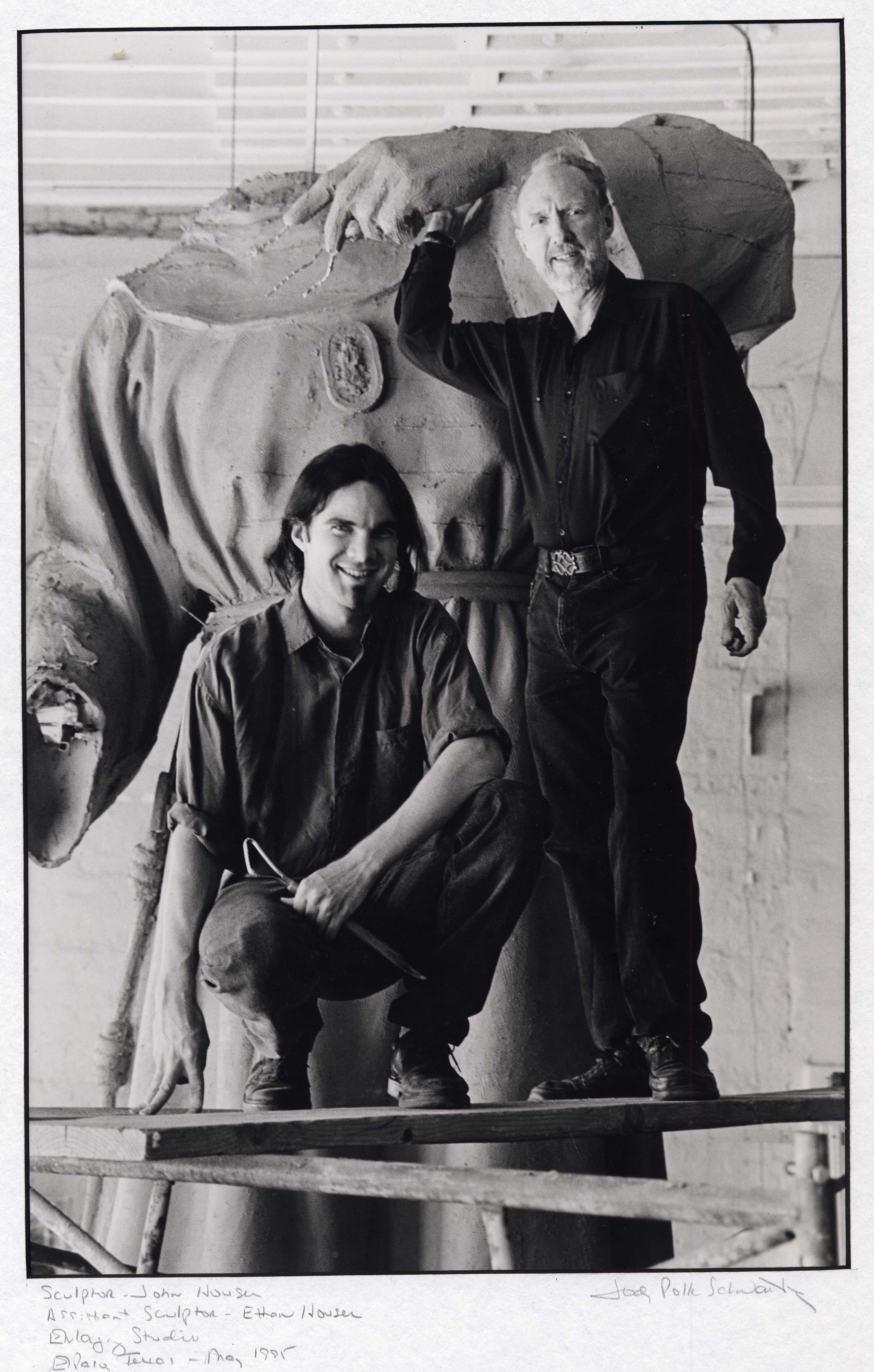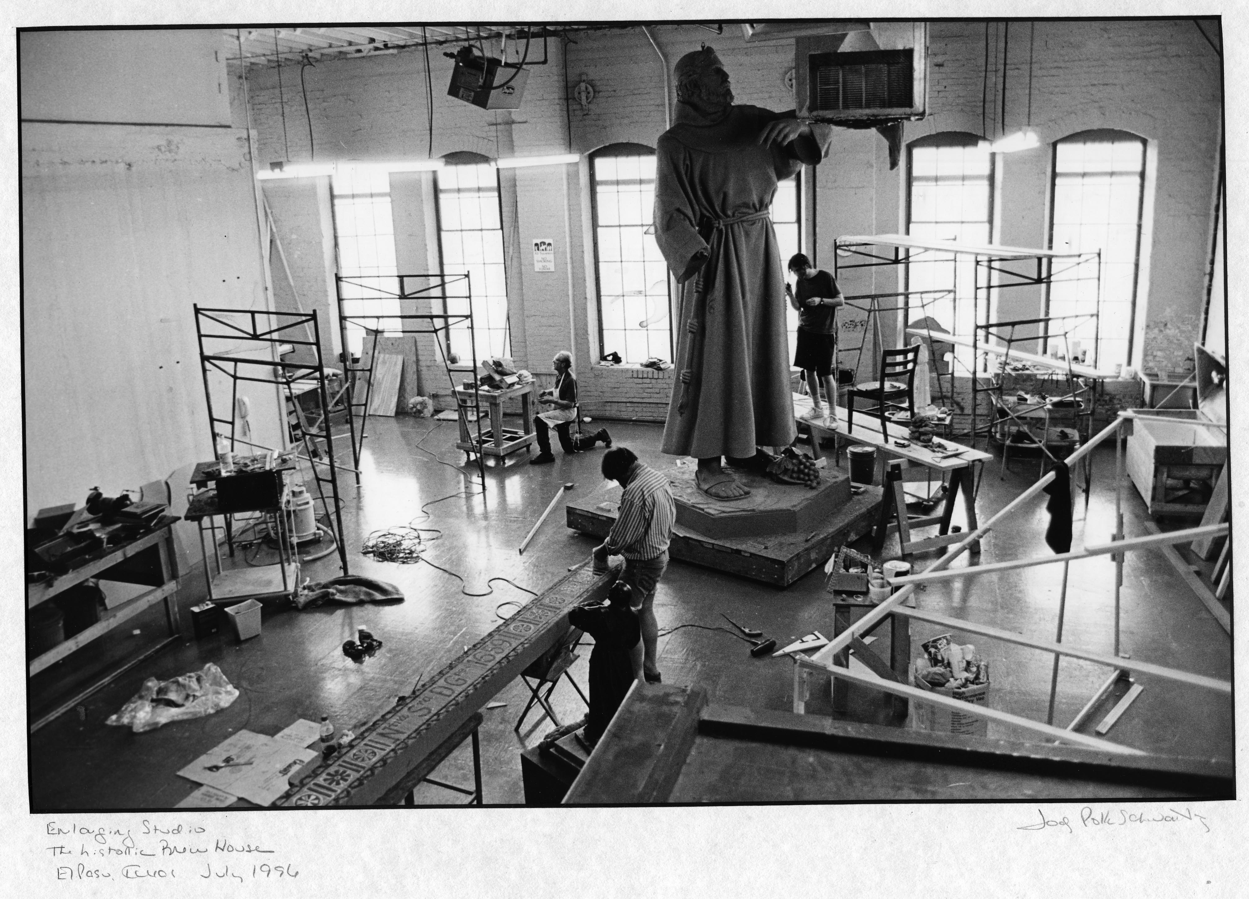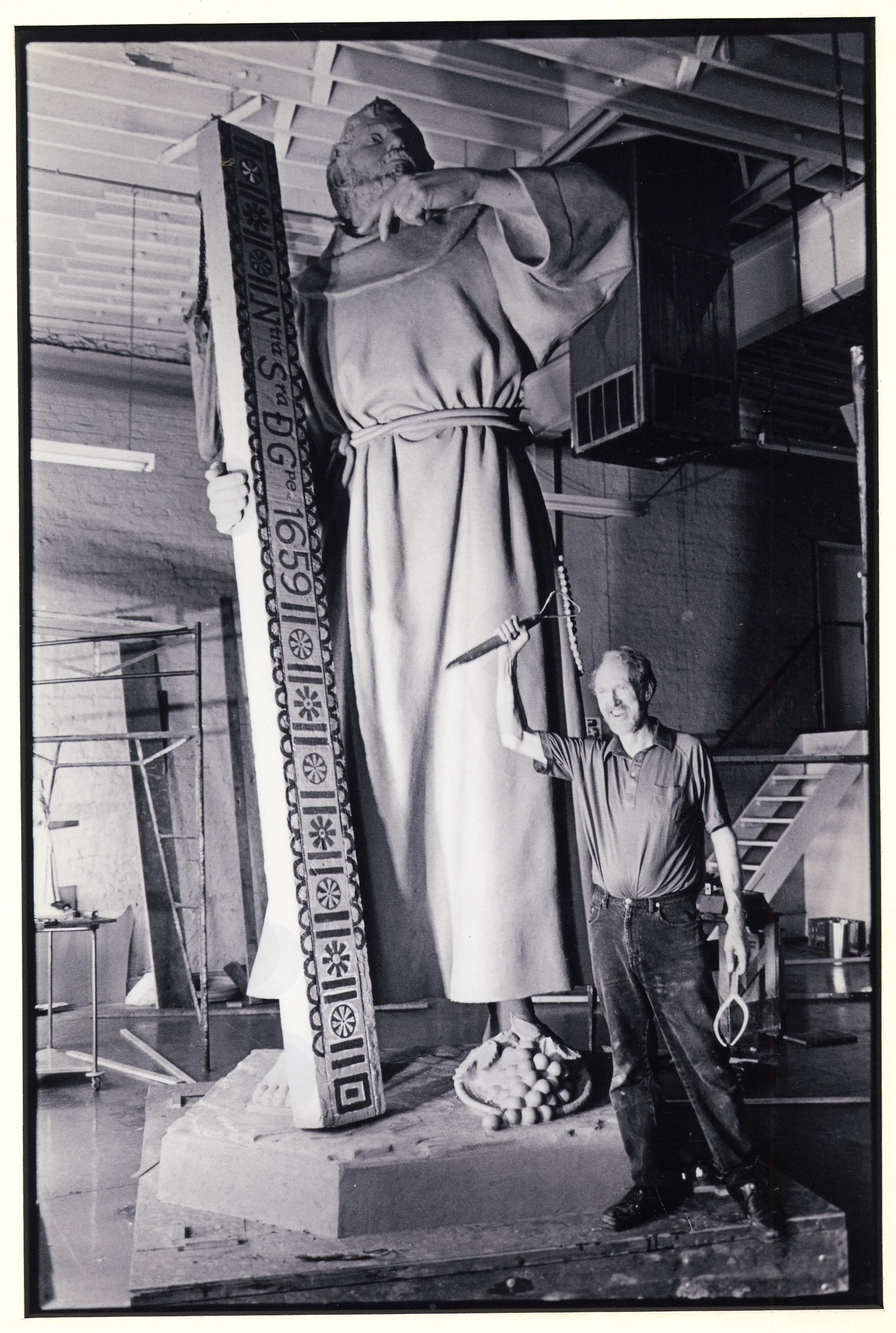 The Fray García Monument, the first statue in the XII Travelers series, was created by sculptor John Sherrill Houser and was dedicated in 1996. Fray García holds the lintel beam for the Guadalupe Mission and beckons to the region's Manso and Suma Indians to join him in building the construction of the Guadalupe Mission at the Pass of the North, which today is the historical treasure in downtown Cd. Juarez, El Paso's sister city. The beam is inscribed with the name of the mission and the year of its founding, 1659. Spanish and Indian craftsmen carved the ceiling beams with floral designs, which are resplendent today. At Fray García's feet is an Indian basket laden with the Mission Grape. He introduced Christianity and European agriculture and livestock to the region. The Guadlupe medallion hangs from his neck, and at his waist are the Franciscan crucifix and rosary. The bronze maquette was permanently installed at the entrance of the old mission, Nuestra Señora de Guadalup that was built by Fray García and still stands in Ciudad Juárez, Mexico.
