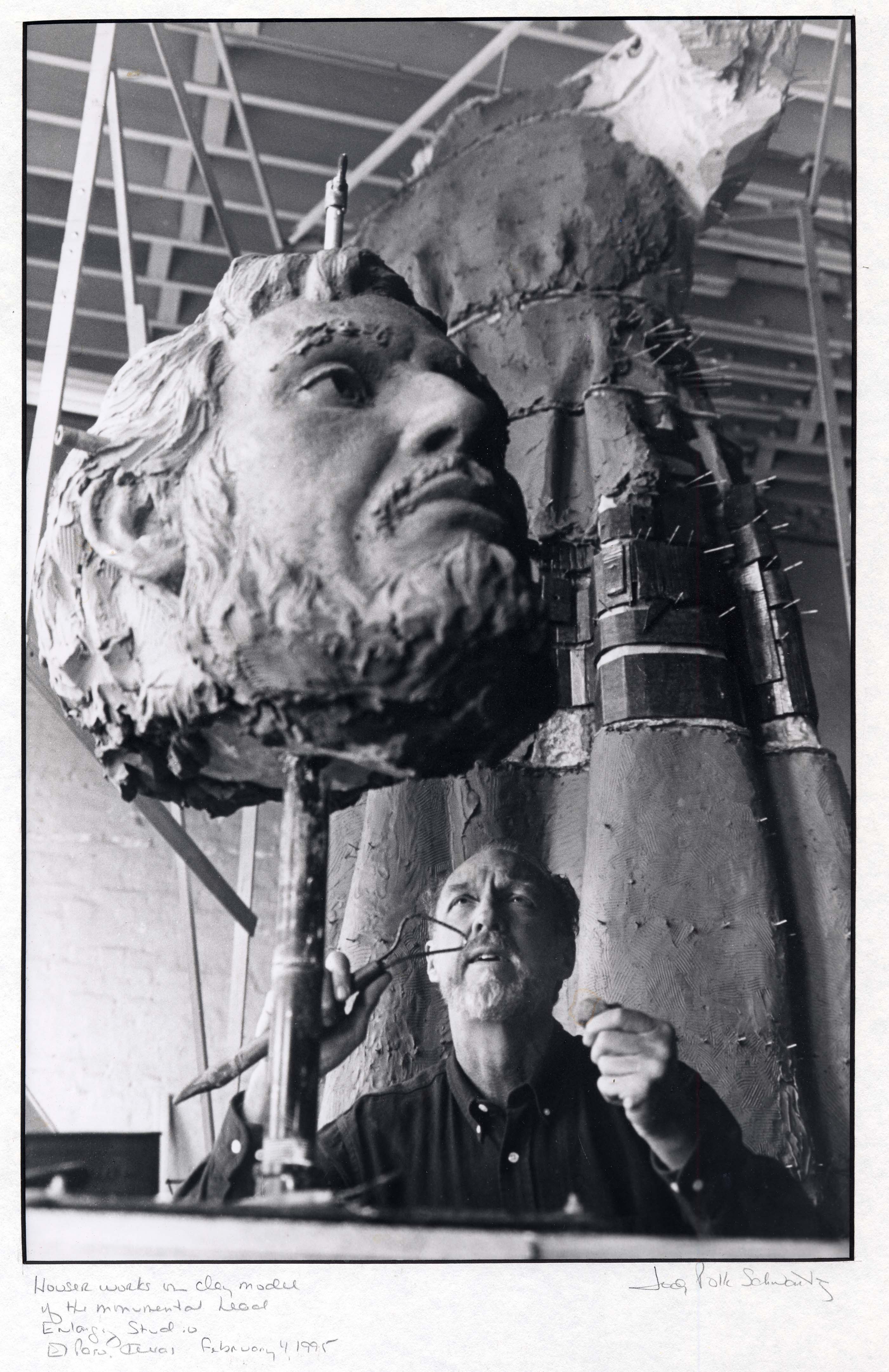 The Fray García Monument, the first statue in the XII Travelers series, was created by sculptor John Sherrill Houser and was dedicated in 1996. Fray García holds the lintel beam for the Guadalupe Mission and beckons to the region's Manso and Suma Indians to join him in building the construction of the Guadalupe Mission at the Pass of the North, which today is the historical treasure in downtown Cd. Juarez, El Paso's sister city. The beam is inscribed with the name of the mission and the year of its founding, 1659. Spanish and Indian craftsmen carved the ceiling beams with floral designs, which are resplendent today. At Fray García's feet is an Indian basket laden with the Mission Grape. He introduced Christianity and European agriculture and livestock to the region. The Guadlupe medallion hangs from his neck, and at his waist are the Franciscan crucifix and rosary. The bronze maquette was permanently installed at the entrance of the old mission, Nuestra Señora de Guadalup that was built by Fray García and still stands in Ciudad Juárez, Mexico.