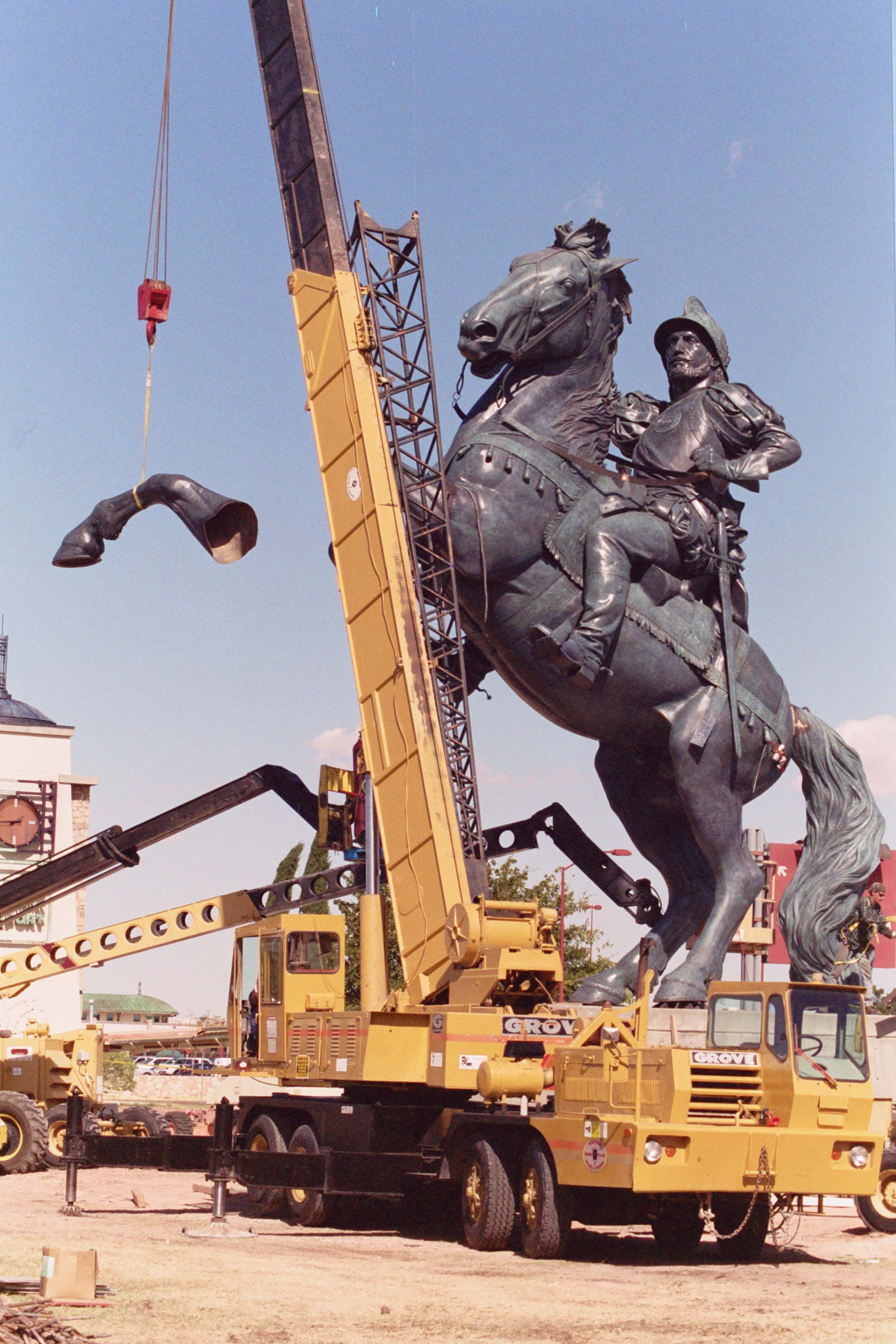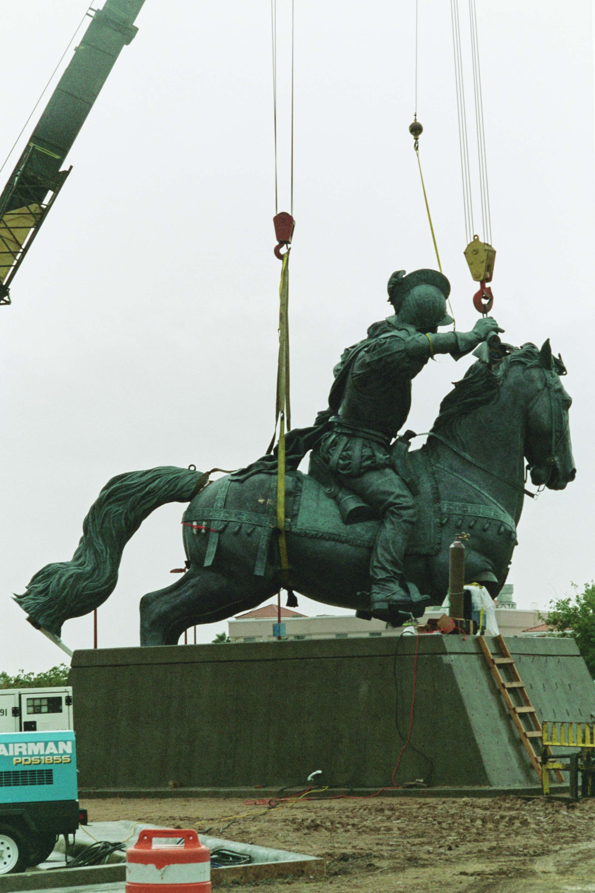 The Equestrian was ten years in the making. In 1992 sculptor John Houser was commissioned by the City of El Paso to create an equestrian monument of Don Juan de Oñate, Founder of the Hispanic Southwest and Camino Real in 1598 and who also gave our city its name - El Paso del Norte. It was the second monument in the XII Travelers series, which was created to commemorate the 400 plus year history of our region. In January of 1997, El Paso City Council approved the Oñate maquette (model). In November of 2003, because of controversy, the name was changed to "The Equestrian".